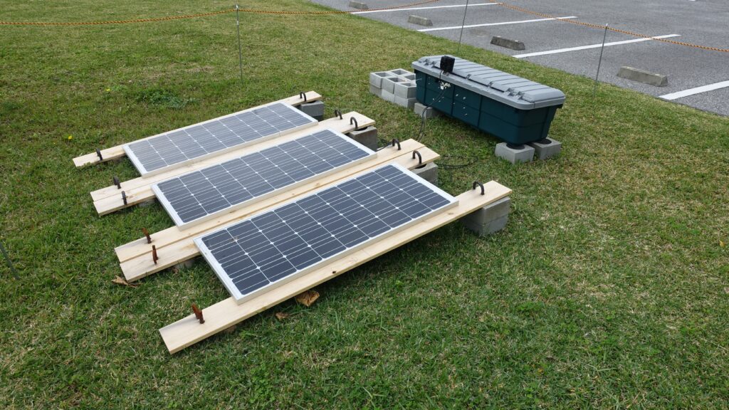 図1は工学部駐車場の芝生に設置された太陽電池パネルである。太陽電池の他に計測装置やバッテリー(蓄電池)を同梱するための電池ボックスが設置されている。太陽電池は現在1種類のみ設置されているが、今後も他の太陽電池を設置する予定である。これらの太陽電池の特性を同一環境で測定することにより細かい特性を収集可能である。電池ボックスには現在のところ鉛蓄電池が用いられているが、充電特性を比較するために各種リチウムイオン電池を接続する予定である。また、蓄電池と太陽電池パネル間に接続されるコントローラも各種接続することで充電能力を比較する予定である。