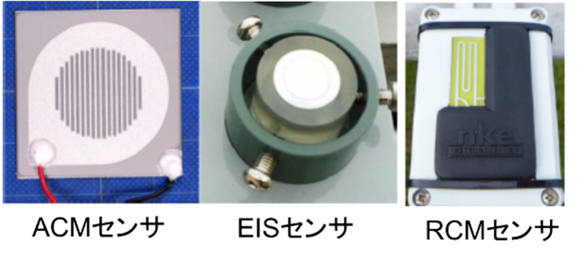 ACMはFeとAgの異種金属接触腐食センサ,EISは二電極間に交流電圧10mVを印加し,高周波(10kHz)と低周波(10mHz)の差分が腐食の抵抗に相当します。したがって,抵抗が小さいと腐食が進行しやすいことを意味します。RCMは,電気抵抗値の変化から腐食による減肉量が推定できます。