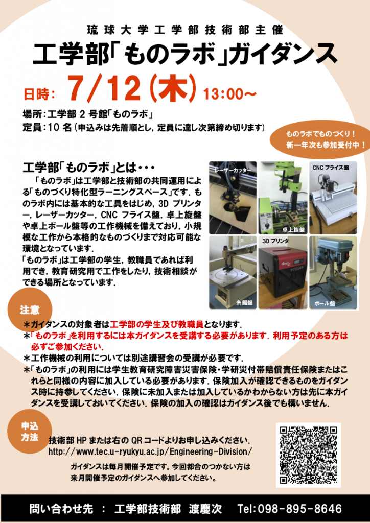 ものラボガイダンス7月分のご案内です。 ものラボを利用するためには必須のガイダンスになりますので、興味のある方は是非受講して下さい。