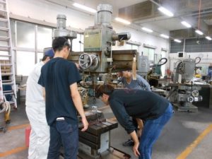 機械工学コース2年次60名を対象に月曜日の3・4時限に開講されている材料加工学実習の教育支援を担っています。具体的には前期および後期30名ずつの2組に分け、下記に示すように1組あたり15週の各テーマを機械システム班6名、工作技術班3名、教員1名で担当し、加工物の材料、形状、機能等に応じた適切な加工方法、加工機に応じた実践的な加工技術などの実技指導を行っています。