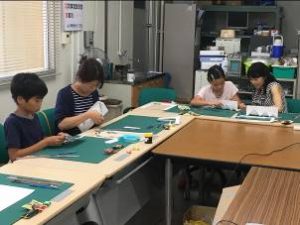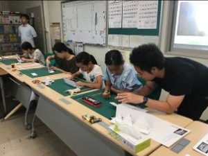 琉球大学工学部技術部において夏休み工作教室「折り紙建築」を開催しました。参加した皆さんは、熱心に作品完成に向けて取り組んでいました。