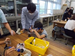 子ども達は電磁石と磁石コマを作るのですが,その工程にはホットガンやはんだ付けを伴うので火傷等がないように安全対策及び教育を実施してから挑みました。作品完成後,「なぜコマはまわりつづけるのだろう」と子ども達に問いかけし,理解するためには勉強することが大事であるということを伝え,今後の勉学への意欲につながるよう促しました。技術部スタッフの協力もあり,子どもにはものづくりの楽しさ,学ぶことの大切さを伝えることができたのではないかと思います。今後とも夏休み工作教室を推進していきたいと思います。