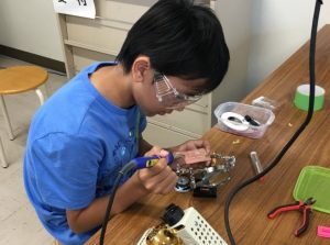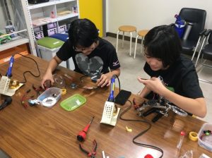この講座は中学生を対象とし,スマートフォン等に接続できる紙コップを利用したアンプ内蔵スピーカーを製作しました.講座の中では,初めて扱うはんだごてと細かい電子部品のはんだ付けに苦戦しつつも熱心に取り組む姿がとても印象的でした.講習後には全員がスピーカーを完成することができ,自分の手で作ったスピーカーから音が出た瞬間は笑顔いっぱいで達成感に満ちているようでした.本講座を通して,ものづくりの面白さや工学分野への興味・関心の向上につながる良い経験となり,受講生の今後の進路選択への一つの材料になればと思います.