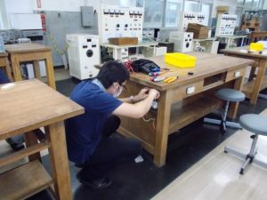 電気工事士並びに認定電気工事従事者の技術の保持のための実務研修である。今年も前年同様,電気電子工学科所有の実験室において経年劣化している実験台のコンセント取替作業(分電盤ブレーカ切断および停電確認,廃線の末端処理,既存コンセントの撤去,配線取り回し,寸法取り,「の」の字曲げ,ステープルの固定方法)とした。