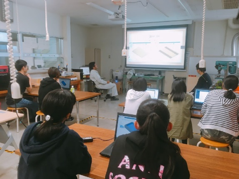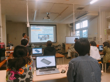 今回は3D CAD/CAM/CAEによる設計、各工作機械を運転するための加工データの作成、レーザーカッターとCNCフライス盤による材料加工、組み立て仕上げ作業等のモノづくりの流れを一貫して体験してもらいました。