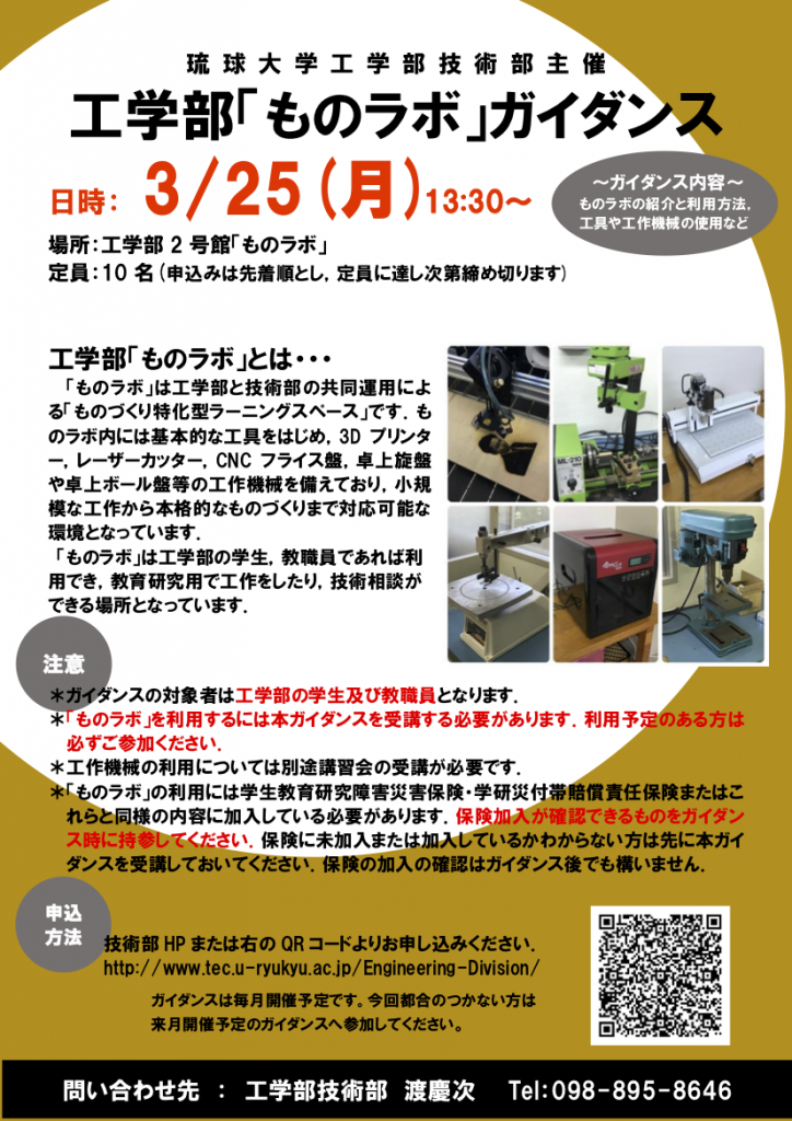ものラボガイダンス3月分のご案内です。ものラボを利用するためには必須のガイダンスになりますので、興味のある方は是非受講して下さい。