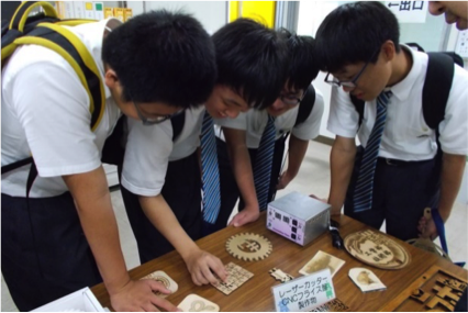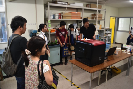 2019年7月13日(土)に琉球大学オープンキャンパスが開催されました。工学部では各コースによる施設見学や体験ツアーが実施される中、技術部においても工学部ものづくり特化型ラーニングスペース「ものラボ」の施設紹介として技術部職員による工作機械のデモ加工実演、製作品展示、工作機械の紹介ポスター展示を行いました。当日は高校生や保護者の方など、多くの方が「ものラボ」に立ち寄り、ものラボ内に設置している3Dプリンタ、レーザーカッター、CNCフライス盤といった工作機械のデモ加工実演や展示した製作品を見学して頂きました。また、それらに対して多くの質問が飛び交い、普段の生活では見る機会が少ない「ものづくり」の現場に非常に興味を持たれている様子でした。