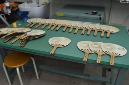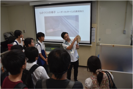 当日の「ものラボ」の見学者に対して、ものラボの工作機械を用いて製作した2種類のデザインを施した木製「うちわ」と3種類のデザインのアクリル製「キーホルダー」をオリジナル記念品として見学者へ配布しました。うちわを配布する際には見学者自身の名前をレーザーカッターで刻印し、各自のオリジナルうちわとして配布ました。受け取った見学者には大変好評で予定数全て配布終了となりました。