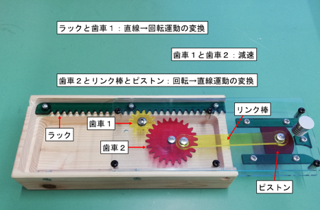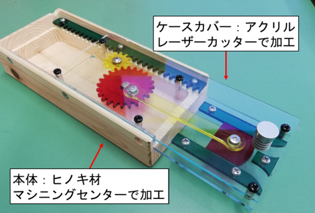 本体とケースカバーの2つのユニットで構成し、本体は工作工場のマシニングセンター、ケースカバーのアクリルパーツはものラボのレーザーカッターで加工した後に本体に組み立てて完成させます。カバーを開くと歯車が回転して力が伝動し、リンク棒で歯車の回転運動をピストンの直線運動に変換する仕組みで、機械工学の要素を取り入れたペンケースを設計して作ってみました!