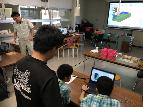 はじめに末吉先生が研究紹介を行った後、受講生自身が3D CADでペンケース本体のモデリングを行い、完成した本体モデルにケースカバーのアクリルパーツモデルを組み立てていきました。時間の都合上、組立のモデリングは最後までは出来ませんでしたが、パソコン上で部品同士の結合や組立手順を考えることが出来る3D CADの世界を体験してもらい、午後からは加工を行うためのデータ作成を行いました。