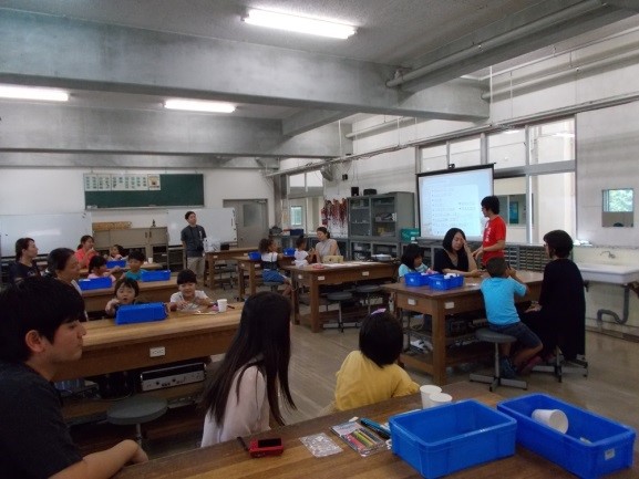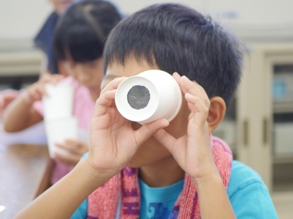 ミラクル万華鏡は小学校低学年向けに開講している人気の公開講座です。「光は波である」という性質を利用して偏光板とセロハンテープを使ってミラクル万華鏡を作りました。子どもたちが出来上がった万華鏡をのぞきこむと,自分の貼ったセロハンテープにカラフルな色がついて歓声が上がりました。最後に,なぜセロハンテープに色が付くのか説明しましたが,みんな理解しようと真剣に聞いてくれていました。