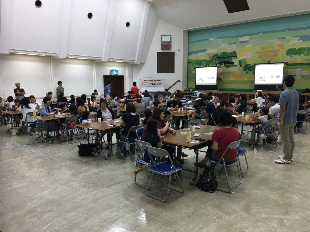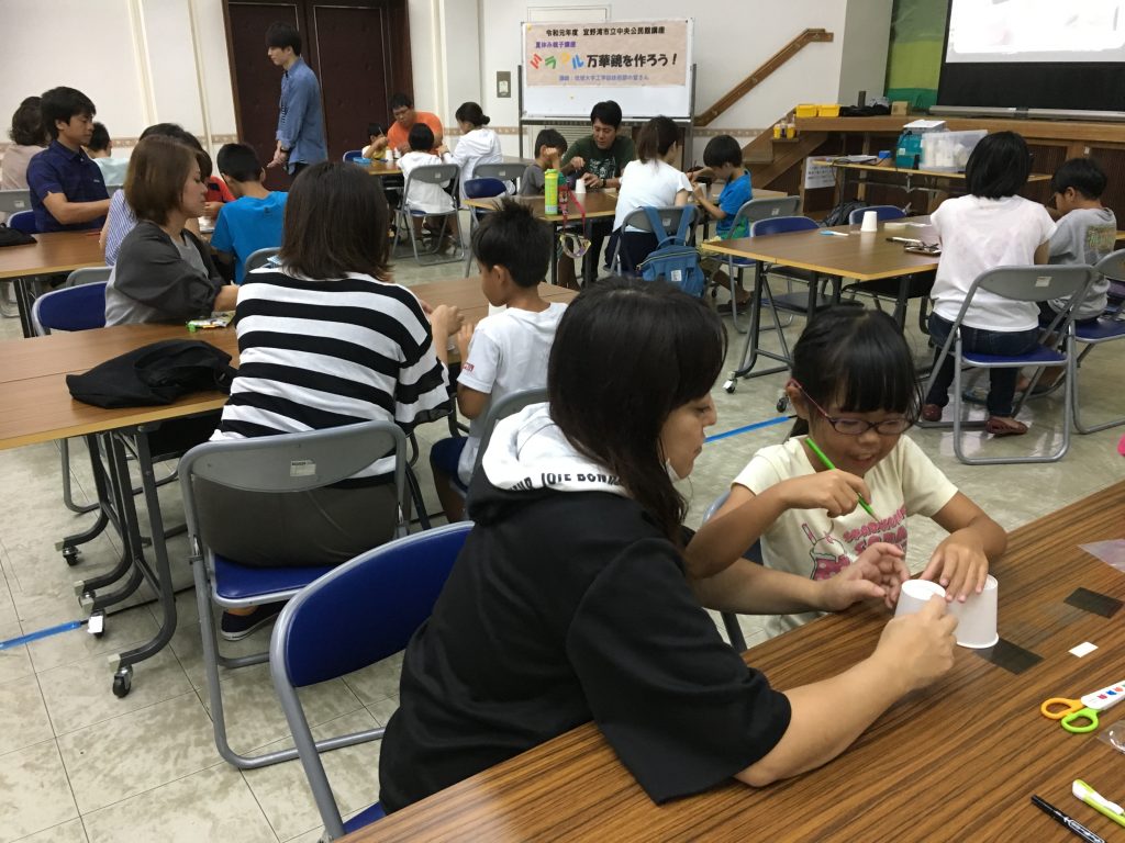 令和元年8月10日(土) ,出前ものづくり講座として,宜野湾市立中央公民館主催 夏休み親子・キッズ講座「ミラクル万華鏡を作ろう」を実施してきました。この講座は“光は波である”をキャッチフレーズに,ものづくりの楽しさ,学ぶことの大切さを体験できます。今回は40組の親子がものづくりを楽しみました。完成した万華鏡をのぞき込むと会場中が感嘆の声で満ち溢れました。