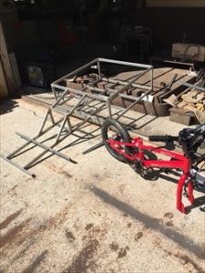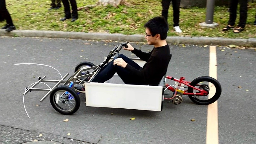 上記の作業中に、材料が予定通りに揃わない問題が発生したため、急遽切断した自転車の残りを再利用し、設計をやり直して車体を製作した。