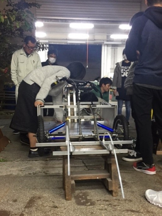 フレームと後輪に使用する自転車 車体の最終組み立て 自転車を再利用した前輪取り付け部 走行会本番のようす