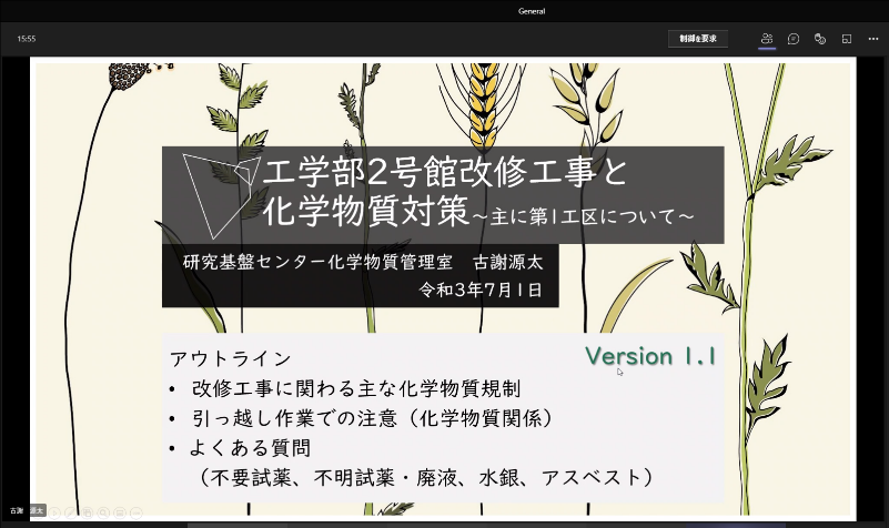 内容:「工学部2号館改修工事と化学物質対策 ~主に第一工区について~」