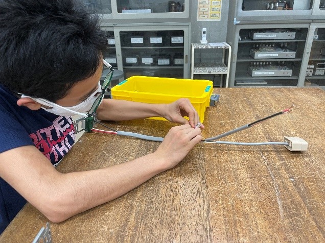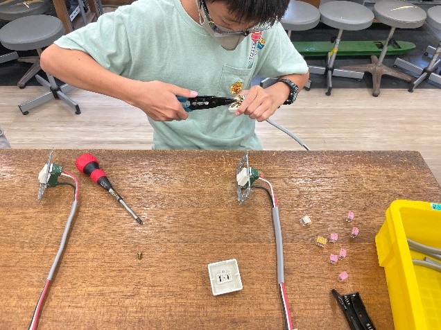 今回中学生向けで実施されたこの講座は、実際の第二種電気工事士試験において過去に出題された課題の一部を製作するというものでした。講座では電気工事士の役割や作業内容、器具の名称や役割を学び、さらに電気工事用工具を使用して、7色に光るLEDを点灯させる回路を作りました。これらの電気工事の体験を通して、ものづくりの楽しさを学ぶことの大切さを伝えています。