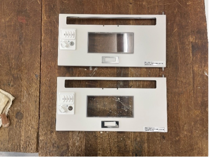 本業務は教職員の書類の受渡しに使用するレターボックスポストの投函口を拡張するといった本学の情報基盤統括センターより依頼された業務になります。ボール盤を用いてポスト扉部の投函口を指定された寸法まで切削加工をした後、既設されたネームプレートを扉上部から下部へ移動させるために穴あけを行い、ネームプレートを取り付けました。