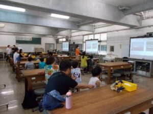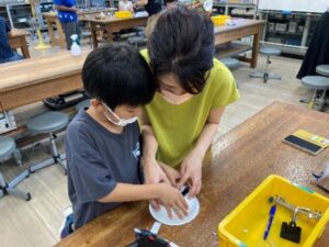 小学生低学年向けに実施されている本講座は,カッターやホットガン,はんだごてなど低学年の児童にとって,今まで使用したことのない工具を用いた作業を伴うものづくりでした。裂傷ややけどのないように安全対策や教育を実施し挑みました。「空気の力を作りながら勉強しよう」をキャッチフレーズに,講座を通して,ものづくりの楽しさ,学ぶことの大切さを伝えています。「どうして動くの?」,「どうして机の上から落ちないのか?」,「どうやったら前に進むのか?」など子ども達に疑問を投げかけたことをきっかけに,今後の勉学への意欲の向上につながればと思います。また,講座終了後に,「ホバークラフトを前に進めるためには容器の一部に穴をあければいいんじゃないの?」と尋ねてくる児童がいたのも印象に残りました。