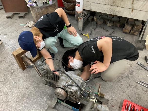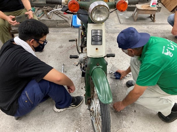 横型エンジン(主にホンダ・スーパーカブに使用)を題材にして、エンジンの仕組みを説明し、分解・組み立ての作業を体験してもらいました。