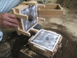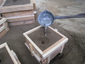 砂型鋳造法(すながたちゅうぞうほう)とは、木枠(きわく)で囲んだ鋳物砂(いものずな)の鋳型(いがた)の中に作りたい物の形と、通り道の空間を作り、とかした金属を流し込んで冷やして固まった後に回りの砂を落とすことで、金属を作りたい物の形にする方法です。できた製品を鋳物(いもの)といいます。