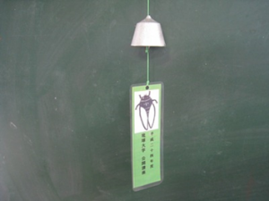 ・ひもで短冊と打ち金をしばって風鈴本体に通して輪ができるように軽くしばって出来上がり。