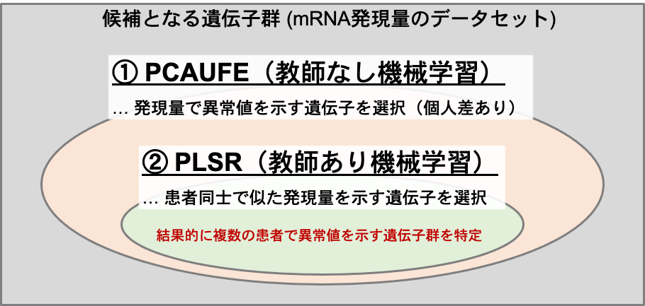 2020年9月1日(火)〜3日(木)にオンライン開催された「2020年日本バイオインフォマティクス学会年会 第9回生命医薬情報学連合大会」にて筆頭著者である修士2年の藤澤孝太さんが発表を行い、ポスター賞を受賞しました.本研究では図1のように「教師なし機械学習」と「教師あり機械学習」を組み合わせることで,病気に関連する遺伝子を数万個の候補から数十程度に生物学的知見に依存せず限定する手法を提案し,肺腺がんに関するデータセットでその有用性を確認しました.