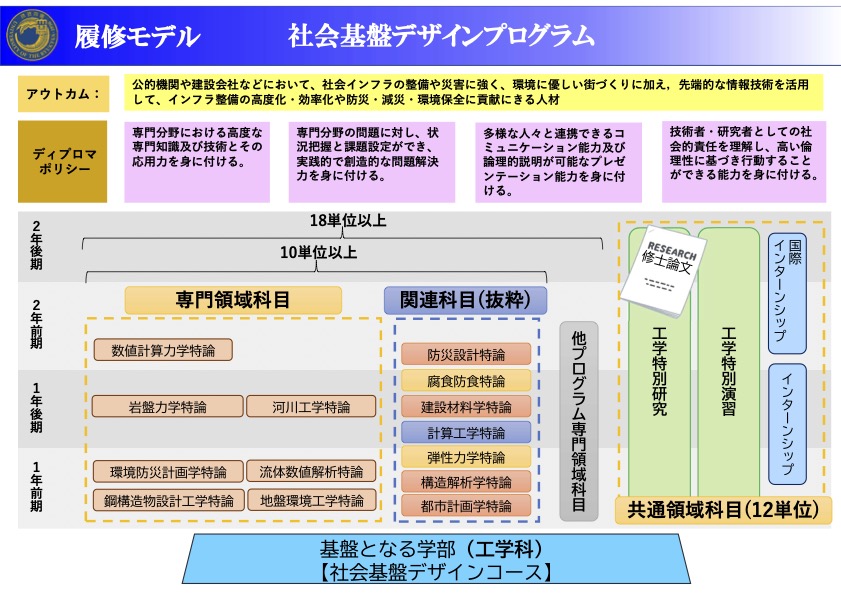 社会基盤デザイン分野では、亜熱帯性・島嶼性・海洋性の地理的特性を活かした環境調和型の工学的価値を創造し、空港、港湾、離島架橋、道路、鉄軌道を含む公共交通システム等、地域の観光リゾート産業を支える持続可能な社会基盤の創成が求められている。一方、気候変動や新エネルギー開発に関わる海洋・海底資源開発、防災減災、環境保全など、グローバルな諸問題解決に貢献できる人材養成が求められている。また、国際的な災害支援拠点、建設技術の国際協力など琉球諸島から国際社会へ貢献できる技術の開発と人材養成が強く求められている。さらに、これらの課題に対し、先端的なIT技術を活用して課題解決に取り組む能力を備えた人材の育成も重視されている。このため、持続可能な社会基盤の創成及び気候変動に伴う防災減災や環境保全などの国内外の社会システム全体を俯瞰できる幅広い視野と専門知識を兼ね備え、地域社会および国際社会へ貢献できる総合的な高度専門技術者を養成する目的で、社会基盤デザインプログラムを設定する。