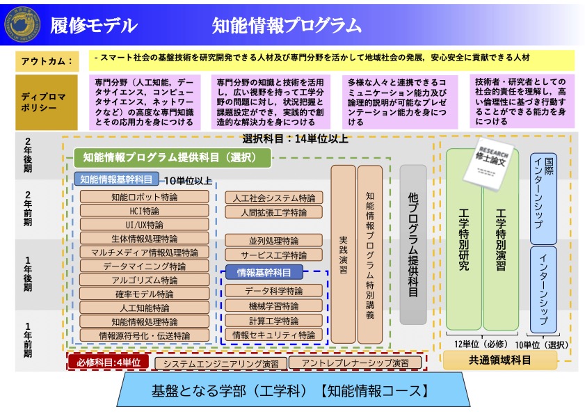 本プログラムでは,スマート社会の実現に向けた基盤技術の研究と応用を通じて,地域社会が抱える多様な課題に取り組み,その発展を安心・安全に支える高度専門人材の育成を目指す.