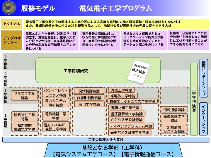 これらの社会的要請に応えるため、電気エネルギー分野、システム制御分野、情報通信およびエレクトロニクスの融合技術により、現代の社会基盤を形成する電力および情報通信インフラを維持・管理しつつ、イノベーションおよびの融合分野において活躍できる高度専門技術者を養成する目的で、電気電子プログラムを設定する。